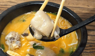 最讓醬醬印象深刻的就是豬腳米線了!好吃到窒息!首先湯頭比較特別,不僅濃郁,還略帶酸香辣味,清爽了豬腳可能帶來的油膩感。原本的頑固不化的豬腳早已繳械投降,非常容易脫骨,軟糯但不爛,膠質(zhì)感十分濃稠,軟糯可口,美味的肉汁和筋蹄組織鮮到舌頭嗦得停不下來!嘬一口米線,抿一口豬腳,吸一口濃湯,啊,人生!豬腳如此,夫復(fù)何求!