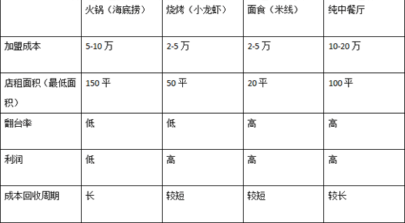 火鍋雖然較為火爆,但市場較飽和,并且初期投資過于高昂,成本回收周期也長。中餐與火鍋情況基本相同,但是很看重商鋪地段。燒烤較其他來說,優(yōu)勢很明顯,也是目前市面上火爆的一大熱點(diǎn)項(xiàng)目,缺點(diǎn)在于,翻臺率低,不符合當(dāng)下社會快節(jié)奏趨勢。面食(米線)在目前看來還是非常有發(fā)展前景的。