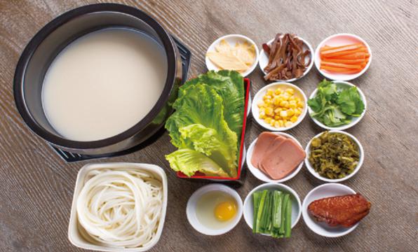 【原料準備】:老母雞、豬筒骨、豬里脊、玉米、鵪鶉蛋、豆干、白木耳、黑木耳、銀耳、酸菜、蒜苗、牛腩、火腿肉、香菜、生菜、雞腿、手工米線等